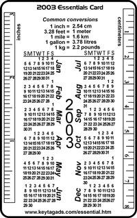 Essential Cards Essential Cards are the newest addition to our product line. A truly unique advertising product for virtually any business, these cards are printed with 'essential' information that is not readily available in many instances. From metric conversions to calendars and rulers, these cards fit easily into a purse or wallet and can be called upon when needed. The cards are printed on credit card style plastic and have an area designated to be customized however you wish. They make ideal business cards and because they are useful, are less likely to be discarded. They even function as a substitute ice scraper in colder climates! Ordering is easy, simply call us at 1-877-897-2755 and we'll get you started. Your card can be very basic; or even include photographs and product shots. Customizable for almost any industry